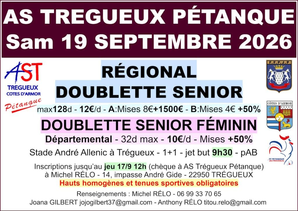 | Samedi 13 juin 2026 Régional de La Bouexière (35) Doublette senior – Poules + A B Flyer | Samedi 20 & dimanche 21 juin 2026 Régional de Pontivy (56) Triplettes seniors – Poules + A B | Dimanche 5 juillet 2026 Régional de Lesneven (29) Doublettes seniors – Poules + A B direct |